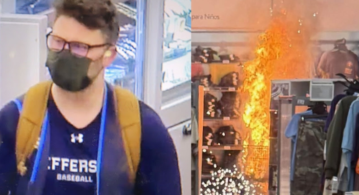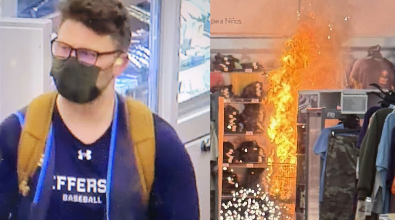 According to investigators, the fire was intentionally set and is believed to have been used as a diversion. Officials allege the suspect utilized camp fuel and fireworks obtained inside the store to ignite a shelf of boys’ clothing. During the evacuation, the individual allegedly forced entry into a jewelry display and removed a quantity of merchandise before leaving the scene.